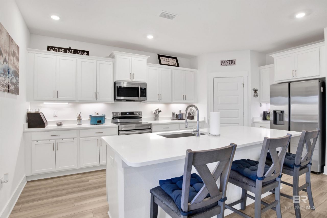 BETTER THAN NEW GOLD FORTIFIED HOME. Completed in late 2024, this new home by Lennar is full of upgrades and added features. The Trevi floor plan (no longer being built) has 4 bedrooms & 3 full bathrooms with 1,943 sq ft of living space, plus a large screened in porch with a HOT TUB. This home is situated on a large lot with facing a common area towards the end of a cul-de-sac with no rear neighbors. The fully fenced back yard adjoins the common area and retention pond. This upgraded home features Shaw Endura Plus durable, waterproof luxury vinyl flooring throughout, with realistic embossing, Soft Silence pad, and is easy to clean and dent resistant. No carpet! Beautiful Quartz Countertops grace the kitchen & bathrooms. You'll love the massive single bowl sink and shaker style cabinetry in the fully equipped kitchen with new stainless steel appliances. The open concept floor plan is great for entertaining with large dining & living spaces. Smooth 9-foot ceilings with tray ceiling insets and 6 craftsman style base boards elevate the interior space. The master suite has an oversized walk-in closet and en suite bath with dual vanities, a deep soaking tub, and separate walk-in shower. 3 generous guest bedrooms (one with an en-suite guest bathroom), offer plenty of space for family & friends to visit you at the beach. Outdoors is a large fenced back yard with landscaping and a quiet screened in porch. Extra concrete extends your outdoor living area with your very own private hot tub and space for grilling & dining. Inside, the home has been updated with new ceiling fans, blinds, & curtains. All appliances convey with acceptable offer. The new Greenbrier neighborhood is conveniently located near shopping, dining, & entertainment in south Foley, less than 10 miles to the beach! This 4/3 floor plan is rare in the area and this one is a delight! Buyer to verify all information during due diligence.