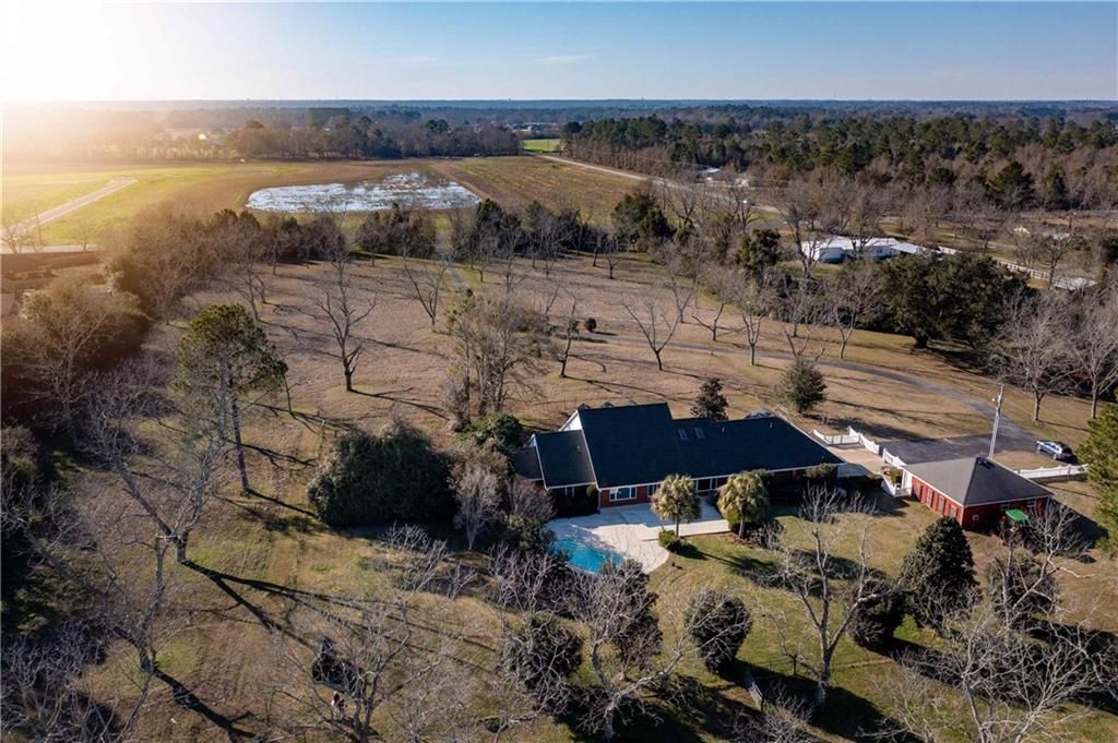A sprawling one-story estate sits tucked away on 17.7 acres of serene, private land with horse barn and detached garage, just 20 minutes from downtown Mobile. Built in 1992, this beautifully maintained open concept home is just over 3,900 sq ft. Ideal for entertaining the separate dining room opens to a sprawling living area with double sided gas fireplace perfectly positioned maximizing privacy and taking advantage of the peaceful views of pool, pastures and half acre lake back patio, inground gunite saltwater pool and rolling pastures. With the same views and just off the living room are the kitchen and breakfast areas with a 7 x 5 bar (with a wine and small fridge). There are two gas water heaters, one is tankless. The interior has been freshly repainted, and all the inside plumbing has been replaced. Both HVAC systems (inside and out) were replaced in Q4 2025. Roof replaced in 2019. Out side you'll find a 7-stall horse barn, 1 stall currently used for feed, with huge fans, running water, 2x6 plank construction and rubber mat flooring. The barn is an original structure and presents an excellent opportunity for renovation or restoration by the next owner. There are 3 pastures and 5 paddocks with cross tied fencing. More features include a chicken house, established southern trees, and a detached, finished 2 car garage with abundant attic storage. There is a large buffer area behind the property reserving long-term privacy. What a rare opportunity for country living with modern updates and convenience! Buyer to verify all information during due diligence.