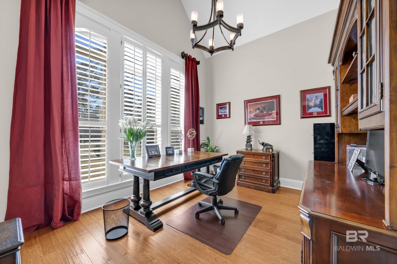 TimberCreek living at it's finest. This exquisite, custom-built home on a quiet cul-de-sac, features an expansive entertainment-level layout. Enjoy evenings on the back patio grilling or enjoying a dip in the hot tub with a private, wooded backyard, offering the perfect blend of luxury and seclusion. Located in the coveted TimberCreek Golf Course Community with 27 holes and clubhouse, a restaurant plus pro shop. Zoned for Rockwell/Spanish Fort School District, this home provides both comfort and convenience. Step through the grand arched French doors into a stunning entryway with soaring ceilings, elegant crown molding, and rich hardwood flooring. Thoughtfully designed with a spacious and versatile floor plan, this home boasts 5 bedrooms, 4.5 baths, a keeping room, a formal living room, an office, sunroom, a large bonus room, plus a theater room with an additional bar room area. A few more bonuses: upstairs laundry chute to washroom, geothermal heating/cooling system, 2 tankless hot water heaters, custom cabinets with soft close drawers, pull out spice drawers, walk-in closets with automatic lights, termite bond and so much more. Community amenities that are gated include two pools, tennis courts (lined for pickleball as well) fitness room, community center, business/meeting room, sidewalks, and neighborhood security. Call your favorite agent and see it before it's gone! Furnishings negotiable with the exception of a few personal pieces such as the dining room table. Buyer to verify all information during due diligence.