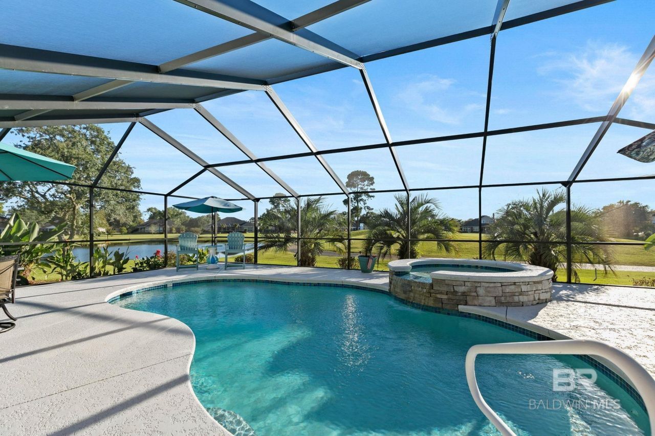 Located in the most desirable community of Craft Farms, this custom, elegant 4-bedroom, 3-bath home with an office offers the perfect blend of comfort, sophistication, and Gulf Coast lifestyle. With 3,125 square feet on nearly half an acre, this residence showcases unparalleled lake and golf course views overlooking the 15th hole of the Cypress Bend Course.Step inside to a spacious open floor plan featuring vaulted ceilings, abundant natural light, and two fireplaces?one in the inviting living room and another in the serene primary suite. The gourmet kitchen is a chef's dream, complete with granite countertops, newer stainless steel appliances (2018), and generous cabinetry for entertaining with ease.The large primary suite offers a peaceful retreat with two walk-in closets and a luxurious spa-inspired bath. Outside, enjoy your private screened-in saltwater pool and spa (new in 2020) with a covered outdoor living area?perfect for relaxing or hosting friends while soaking in the tranquil lakefront and golf course backdrop.Additional features include:New Fortified Roof (2020)New Windows (2019) New HVAC System (2018) 2-Car Garage plus Golf Cart Bay, independent sprinkler system on well with new pump in 2020. Private, no-through-traffic street. Experience resort-style living in a quiet, established neighborhood?all just minutes from the beaches, dining, and shopping of Gulf Shores and Orange Beach. Buyer to verify all information during due diligence.
