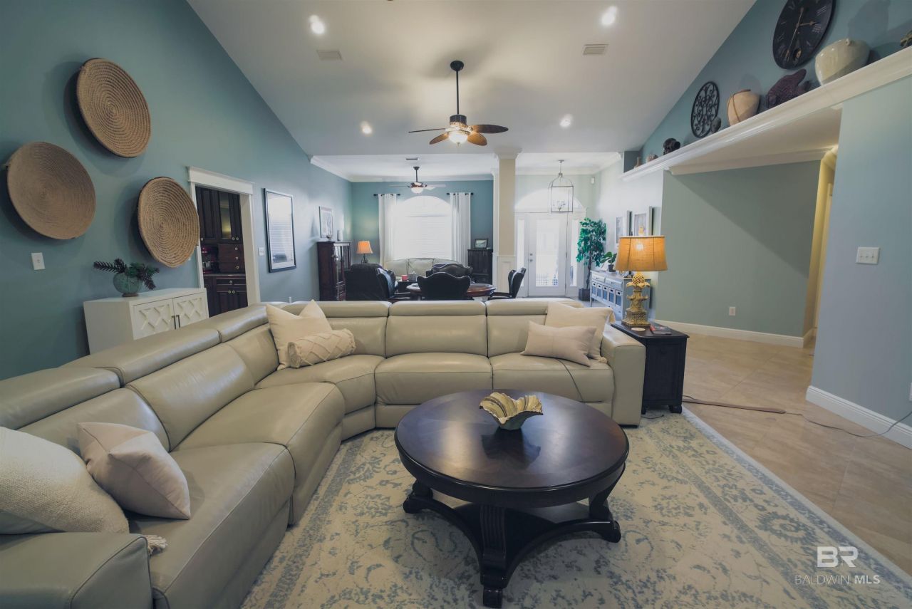 INTERIOR: Remarkable upgrades in this spacious 3000 sq. ft. home. Open Floor Plan with Soaring Ceilings and lots of natural light. The massive great room with open floor plan allowes for spaces to be used interchangeably and creatively. The entire house has tile flooring. The Large Kitchen boasts all Cherry wood cabinetry, custom made, soft close hinges and drawer slides. There is a large marble top island with a secondary sink with disposal (in addition to the window sink and disposal). There are Granite Counters and Back splashs. Stainless appliances. Custom Trim throughout (8 Crown Molding and 6 baseboards. Recessed LED Lighting. The 4th Bedroom has been converted into an office with French Doors. An additional full bath has been added off the 10 X 38 Porch, convenient for Pool use. EXTERIOR: All brick exterior, full length lanai overlooking 16 X 32 Gunite Pool with lighting. Fire Pit. Irrigation system and Pool serviced by Well. Perfect exercise depth of 3 to5 to 4ft (could easily be converted to Salt and Heat added or perfect for added screened cover.) Custom Wooden Mahagony Hurricane shutters on Hinges. Extensive Landscaping with beautiful Palm Trees. Yard backs to trees for Privacy. Double Garage with extra paved parking. Workshop/Storage Building 12 X 16 with Windows. UPGRADES COMPLETED: Full House Renovation 2014, Roof 2020, New Pool Pump 2025, New Hot Water Tank 2022, New Trane HVAC 2016, Updated Landscaping 2024/25. HOME IS LOCATED WITHIN A 20 MINUTE DRIVE TO BEAUTIFUL GULF SHORES BEACHES! Buyer to verify all information during due diligence.