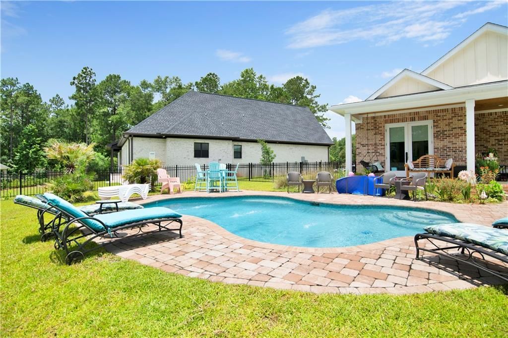 Experience timeless Southern charm with European elegance in this stunning lakefront estate. This custom home offers a well-thoughtfully designed for upscale living and everyday comfort.This 3-sided brick home with a stucco front welcomes you with a grand front porch, Corinthian-style columns, and dual French doors flanking the main entrance. One opens from the private study, which features classic crown molding, and the other from the formal dining room, distinguished by dentil crown molding and glass doorknobs. A stunning brick archway leads into the designer kitchen, featuring luxury Caf? appliances, double ovens, a five-burner gas cooktop, Quartzite counters, a walk-in pantry, and a peninsula ideal for entertaining or casual dining. The backsplash was carefully selected to blend antique, rustic, and coastal elements.The open-concept kitchen flows into the family room with soaring beamed ceilings, built-in 52in cabinetry, and natural light pouring in through expansive windows. French doors open to a covered back porch with tongue-and-groove ceilings, a gas fireplace, and additional gas lines ready for an outdoor kitchen setup.The main-level primary suite offers a serene and elegant escape, boasting vaulted ceilings, rustic exposed beams, and tall antique Hungarian French doors with exquisitely etched glass panels portraying cherubs-an embodiment of old-world European craftsmanship and romantic detail. Step through these doors into a spa-inspired bathroom retreat, complete with a luxurious tile shower, vintage-style clawfoot soaking tub, dual walk-in closets, and a custom-designed shoe closet. Overhead, a stunning chandelier is framed by an ornate ceiling medallion, where cherubs are delicately etched into the design, adding a final touch of timeless refinement. Upstairs, you'll find three additional bedrooms-each with spacious walk-in closets-a full bath featuring Venetian-style mirrors and a double vanity, and a large flex space perfect for a game or media area. Two of the upstairs bedrooms open onto a fully functional second-level balcony with French doors and tranquil views of the surrounding nature and neighborhood. A fifth bedroom on the main level is currently used as a craft room, offering flexible use of space. Additional highlights include: Irrigation systemGutter systemSaltwater poolTwo tankless water heatersAntique glass doorknobs throughoutNearly 9-foot antique doors in the primary suite8-foot interior doors throughoutWood blinds with additional window treatments throughout the homeChandeliers in key areas; a beautifully crafted built-in china wall unit for a stunning displayMudroom with built-ins off the 2-car garageClimate-controlled garage storage roomSpacious laundry room with utility sink and cabinetsCurrent termite coverage with Wayne's and Gold Certified roof with transferable builder's warranty; All situated on a peaceful, fishable lake, alive with birds, geese, turtles, and more-creating a serene natura